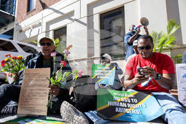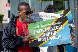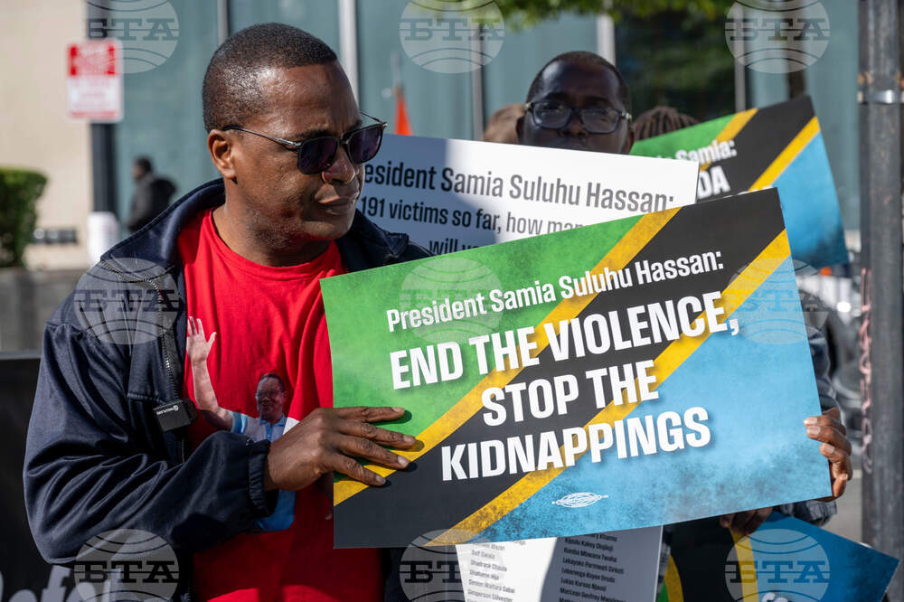 IMAGE DISTRIBUTED FOR MARCH FOR JUSTICE IN TANZANIA - Human rights activists demonstrate outside the Tanzanian Embassy during the World Bank Annual Meetings, to urge world leaders to act against Tanzania's worsening human rights crisis and the disappearance of critics under President Samia Suluhu Hassan, Friday, Oct. 17, 2025 in Washington. (Kevin WolfAP Content Services for March for Justice in Tanzania)