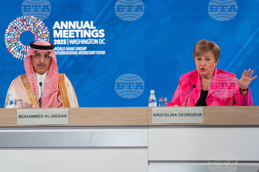 International Monetary and Financial Committee (IMFC) chair, Saudi Arabia's Finance Minister Mohammed Al-Jadaan, left, and International Monetary Fund (IMF) Managing Director Kristalina Georgieva speak during a news conference after the International Monetary and Financial Committee (IMFC) meeting, during the World Bank/IMF Annual Meetings at the International Monetary Fund (IMF) headquarters in Washington, Friday, Oct. 17, 2025. (AP Photo/Jose Luis Magana)