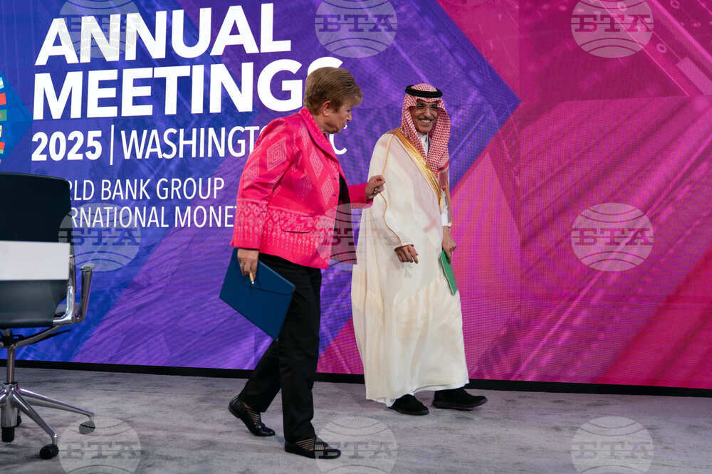 Mohammed Al-Jadaan, International Monetary and Financial Committee (IMFC) chair and Saudi Arabia's Finance Minister, left, and International Monetary Fund (IMF) Managing Director Kristalina Georgieva depart after speaking during a news conference after the International Monetary and Financial Committee (IMFC) meeting, during the World Bank/IMF Annual Meetings at the IMF headquarters in Washington, Friday, Oct. 17, 2025. (AP Photo/Jose Luis Magana)