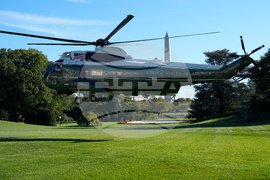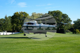 A Marine helicopter returns to the South Lawn after refueling before President Donald Trump boards to depart the White House, Friday, Oct. 17, 2025, in Washington. (AP Photo/Alex Brandon)