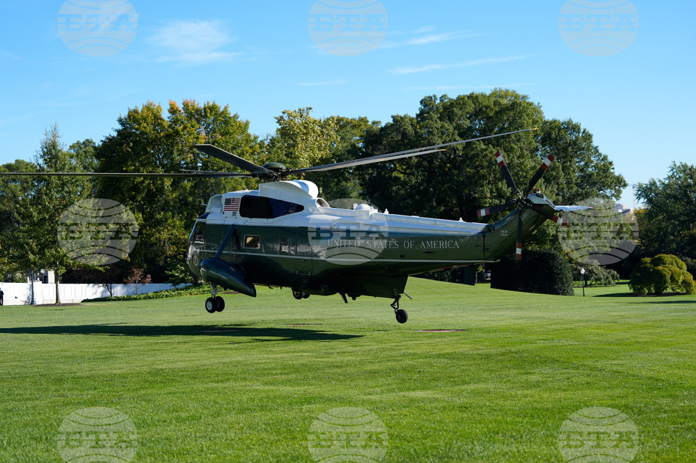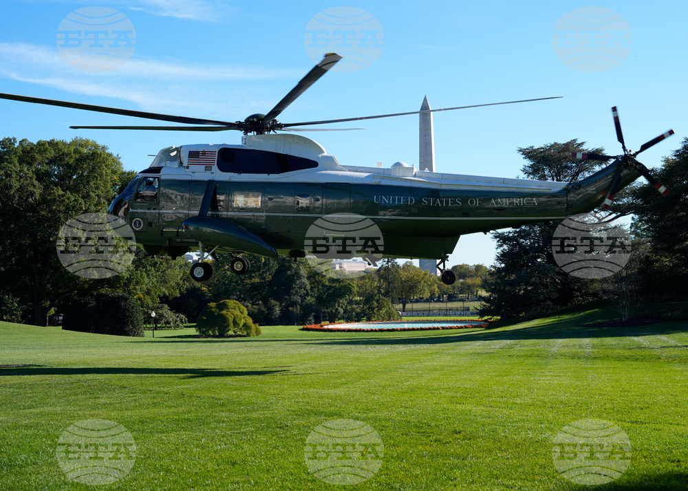 Marine One with President Donald Trump on board departs from the South Lawn of the White House, Friday, Oct. 17, 2025, in Washington. (AP Photo/Alex Brandon)