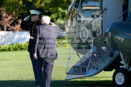 President Donald Trump is saluted by Air Force Col. Christopher M. Robinson, Commander of the 89th Airlift Wing, as he arrives on Marine One to board Air Force One, Friday, Oct. 17, 2025, at Joint Base Andrews, Md., for a trip to Florida. (AP Photo/Mark Schiefelbein)