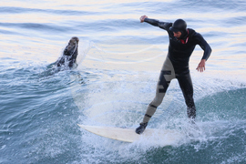 A sea otter pops vertically out of the water behind a surfer at Steamer Lane on Thursday, Oct. 16, 2025, in Santa Cruz, Calif. (Shmuel Thaler/Santa Cruz Sentinel via AP)