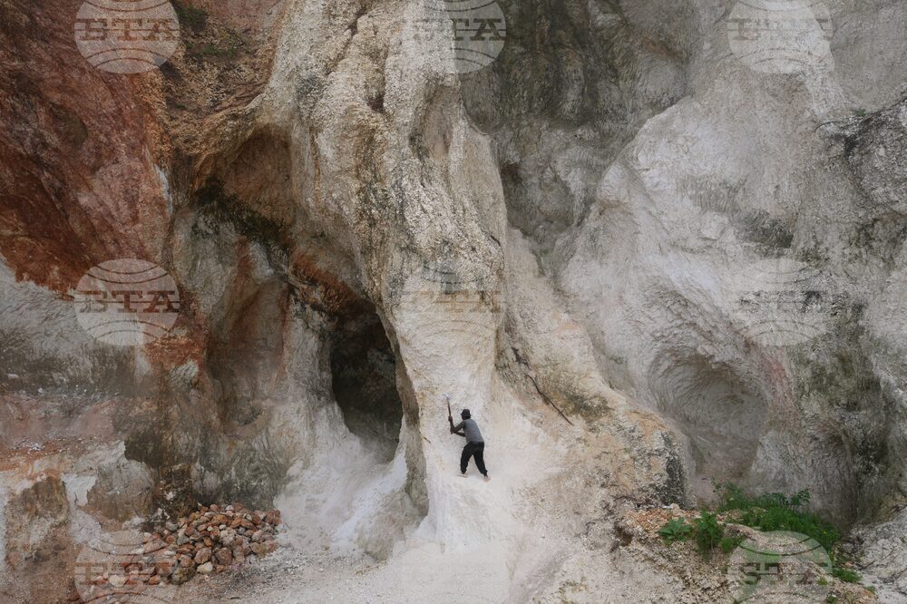 A worker pounds into a wall of rock to make gravel and sand in the Kenscoff neighborhood of Port-au-Prince, Haiti, Friday, Oct. 17, 2025. (AP Photo/Odelyn Joseph)