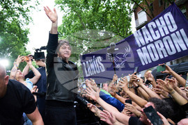 President Javier Milei greets supporters during a campaign rally ahead of midterm elections, in Tres de Febrero, Buenos Aires province, Argentina, Friday, Oct. 17, 2025. (AP Photo/Rodrigo Abd)