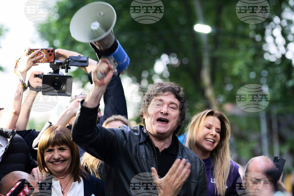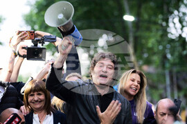 President Javier Milei greets supporters during a campaign rally ahead of legislative national elections, in Tres de Febrero, Buenos Aires province, Argentina, Friday, Oct. 17, 2025. (AP Photo/Rodrigo Abd)