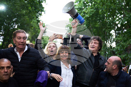 President Javier Milei greets supporters during a campaign rally ahead of mid-term elections, in Tres de Febrero, Buenos Aires province, Argentina, Friday, Oct. 17, 2025. (AP Photo/Rodrigo Abd)