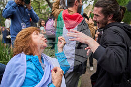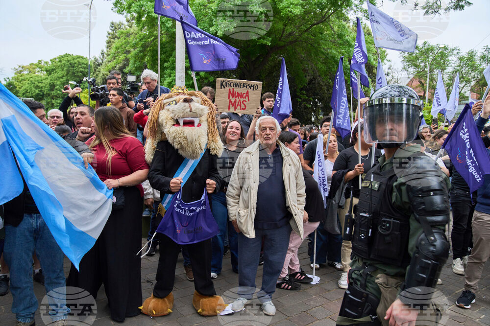 Anti-government demonstrators stands next to security forces ahead of President Javier Milei's campaign rally for the midterm elections, in Tres de Febrero, Buenos Aires province, Argentina, Friday, Oct. 17, 2025. (AP Photo/Rodrigo Abd)