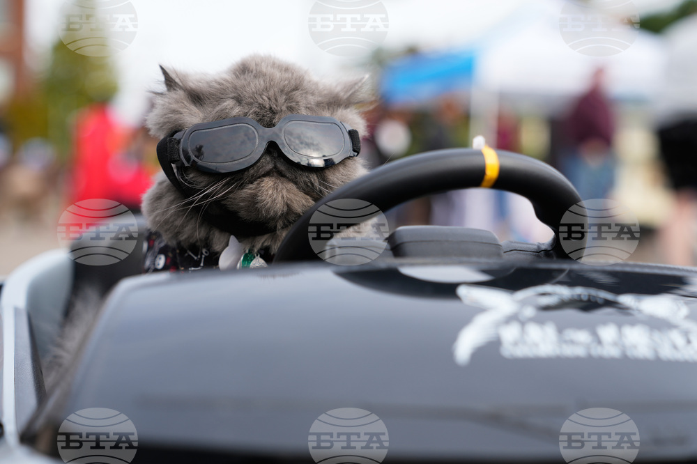 Max, a cat owned by Deb Small, sits in a remote-controlled car during an event for dog trick-or-treating, Friday, Oct. 17, 2025, in Lansing, Mich. (AP Photo/Ryan Sun)