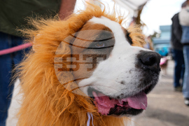 Visitors walk their dogs during an event for dog trick-or-treating, Friday, Oct. 17, 2025, in Lansing, Mich. (AP Photo/Ryan Sun)