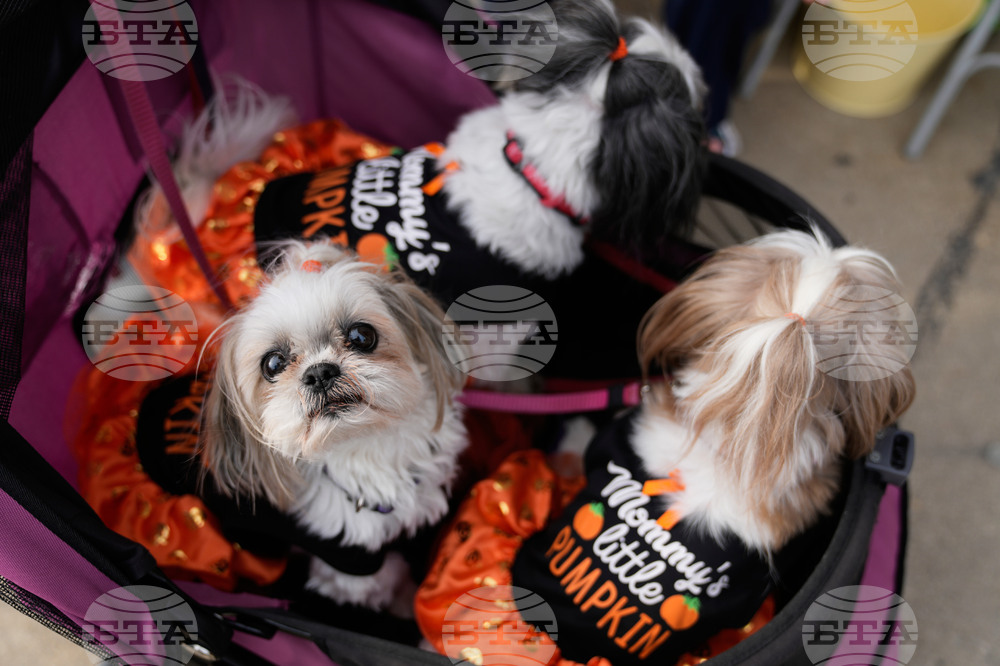 Visitors walk their dogs during an event for dog trick-or-treating, Friday, Oct. 17, 2025, in Lansing, Mich. (AP Photo/Ryan Sun)