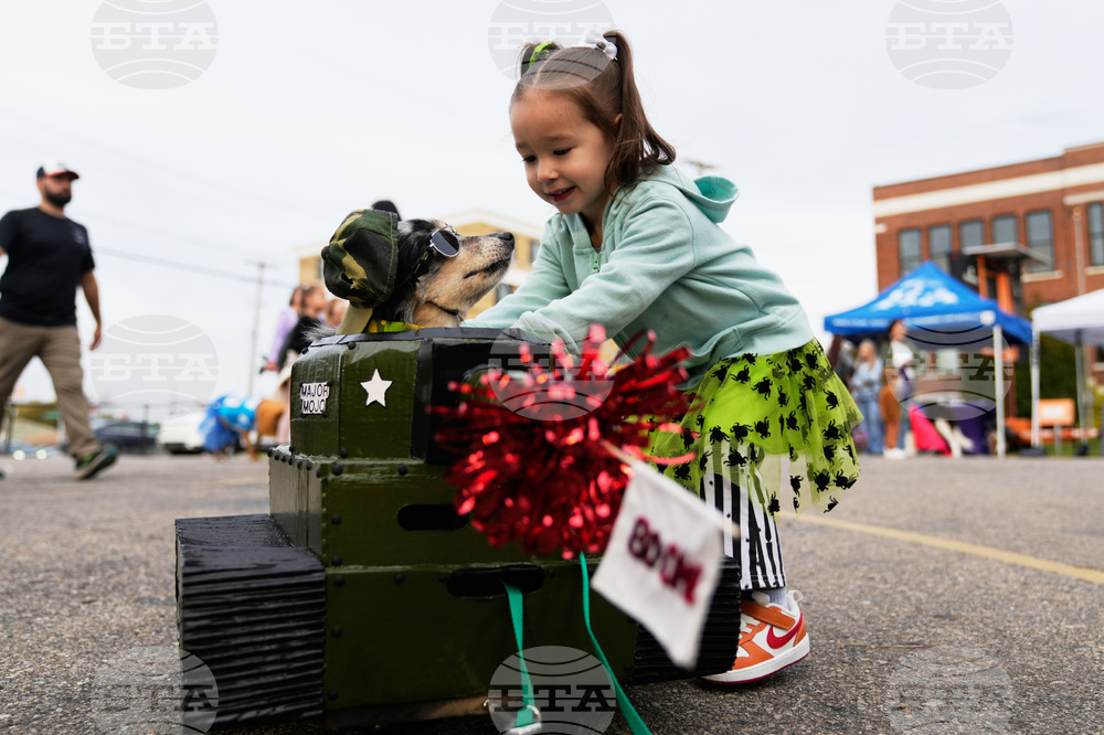Visitors play with Mojo, a dog owned by Alicia Town, of Kalamazoo, as he sits in a tank costume during an event for dog trick-or-treating, Friday, Oct. 17, 2025, in Lansing, Mich. (AP Photo/Ryan Sun)