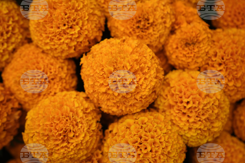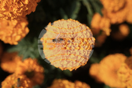 A bee lands on a Cempasuchil bloom in the Xochimilco borough of Mexico City, Friday, Oct. 17, 2025, ahead of the Day of the Dead celebrations. (AP Photo/Claudia Rosel)