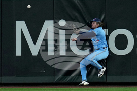 Toronto Blue Jays' Addison Barger can't catch a double hit by Seattle Mariners' Cal Raleigh during the first inning in Game 5 of baseball's American League Championship Series, Friday, Oct. 17, 2025, in Seattle. (AP Photo/Abbie Parr)