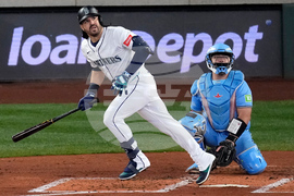 Seattle Mariners' Josh Naylor swings for a strike during the sixth inning in Game 5 of baseball's American League Championship Series against the Toronto Blue Jays , Friday, Oct. 17, 2025, in Seattle. (AP Photo/Abbie Parr)