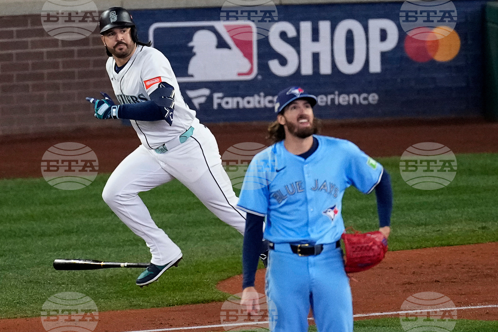 Toronto Blue Jays pitcher Seranthony Domínguez (48) looks on as Seattle Mariners players react after he gave up a grand slam to Mariners' Eugenio Suárez (28) during the eighth inning of Game 5 of baseball's American League Championship Series in Seattle, Friday, Oct. 17, 2025. (Frank Gunn/The Canadian Press via AP)