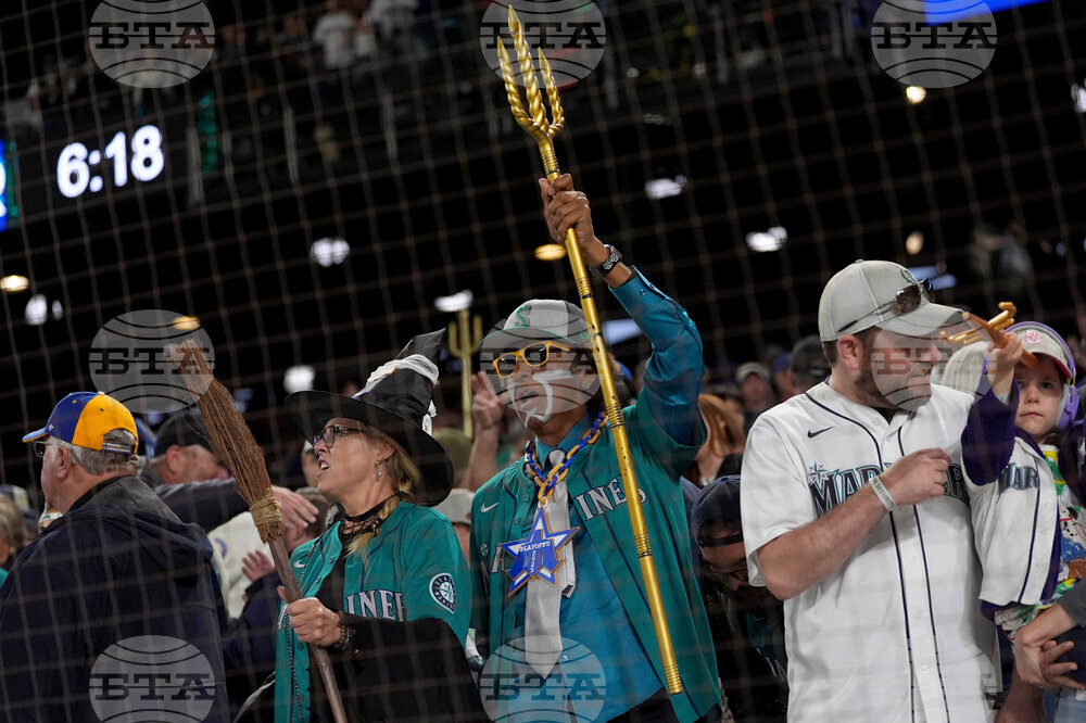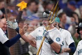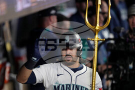 Seattle Mariners' Eugenio Suárez holds the trident after hitting a grand slam home run during the eighth inning in Game 5 of baseball's American League Championship Series against the Toronto Blue Jays, Friday, Oct. 17, 2025, in Seattle. (AP Photo/Lindsey Wasson)