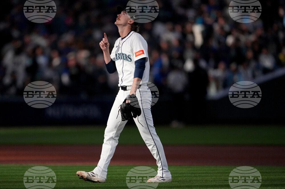 Seattle Mariners pitcher Bryce Miller points upward during the third inning in Game 5 of baseball's American League Championship Series against the Toronto Blue Jays, Friday, Oct. 17, 2025, in Seattle. (AP Photo/Lindsey Wasson)
