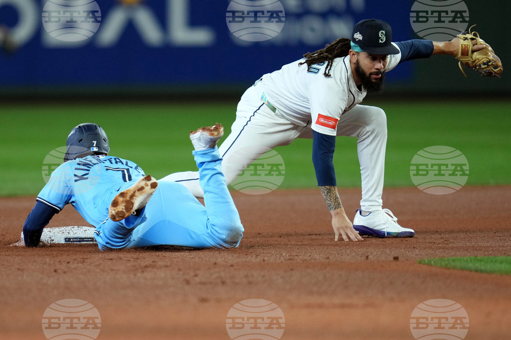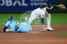 Toronto Blue Jays' Andrés Giménez (0) forces out Seattle Mariners' Josh Naylor (12) at second on a double play hit into by Seattle Mariners Randy Arozarena during the fourth inning in Game 5 of baseball's American League Championship Series, Friday, Oct. 17, 2025, in Seattle. (AP Photo/Lindsey Wasson)
