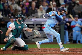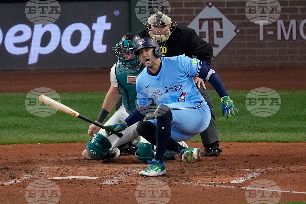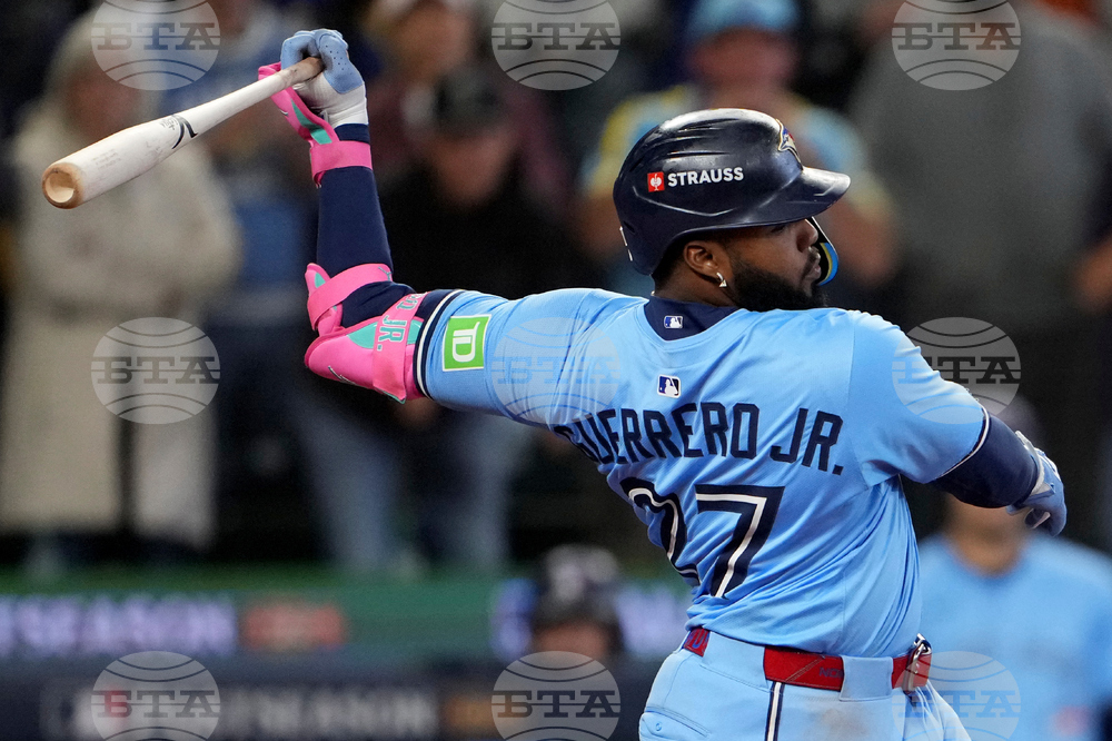 Toronto Blue Jays' Vladimir Guerrero Jr. strikes out to end the fourth inning in Game 5 of baseball's American League Championship Series against the Seattle Mariners, Friday, Oct. 17, 2025, in Seattle. (AP Photo/Lindsey Wasson)