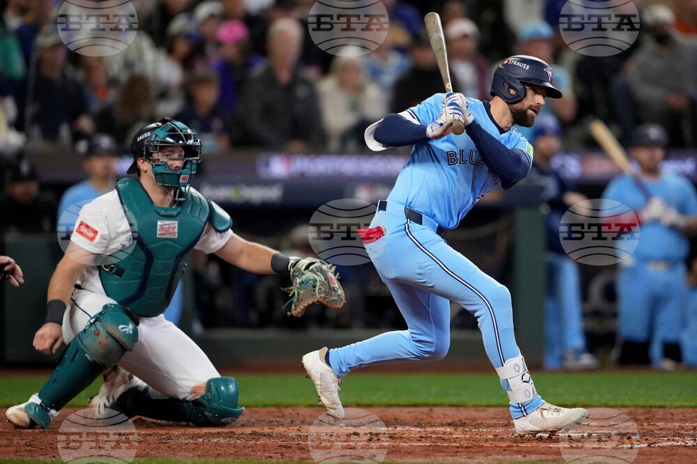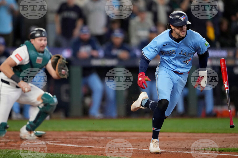 Toronto Blue Jays' George Springer runs out an RBI double past the Seattle Mariners' dugout during the fifth inning in Game 5 of baseball's American League Championship Series, Friday, Oct. 17, 2025, in Seattle. (AP Photo/David J. Phillip)