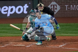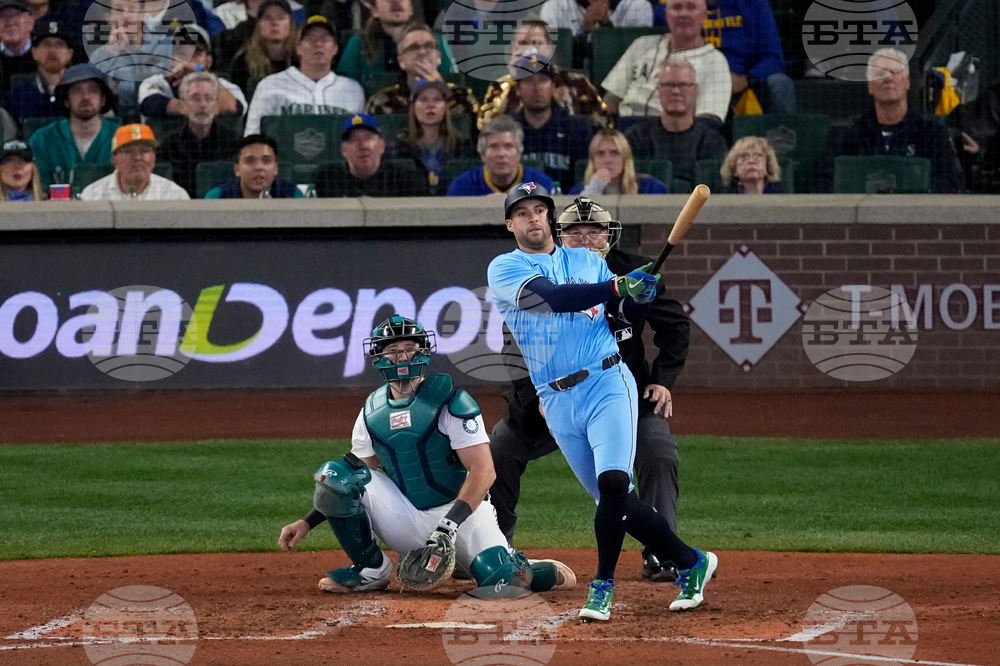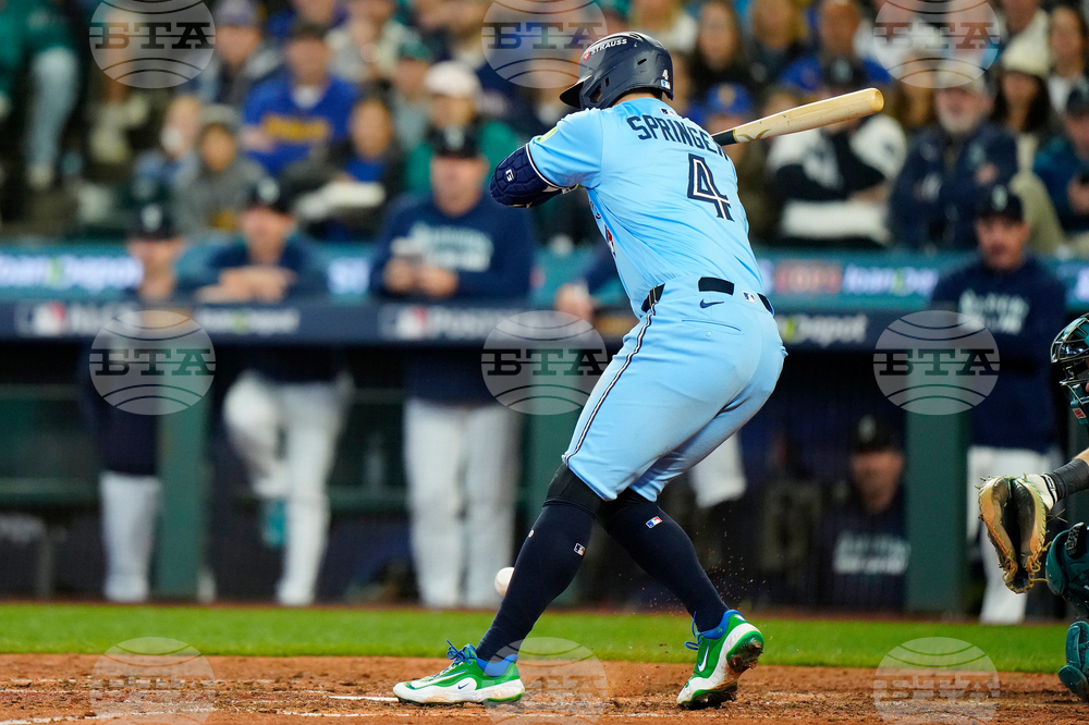 Toronto Blue Jays' George Springer follows through on an RBI double against the Seattle Mariners during the fifth inning in Game 5 of baseball's American League Championship Series, Friday, Oct. 17, 2025, in Seattle. (AP Photo/David J. Phillip)