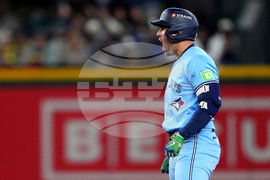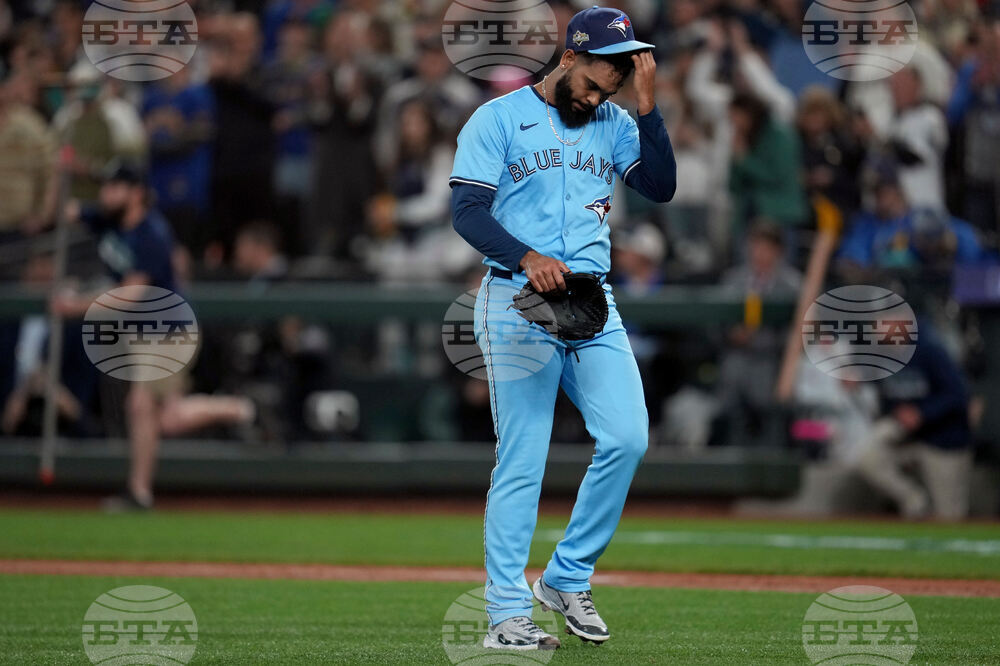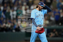 Toronto Blue Jays pitcher Seranthony Domínguez walks off the field at the end of the eighth inning of Game 5 of baseball's American League Championship Series against the Seattle Mariners in Seattle, Friday, Oct. 17, 2025. (Frank Gunn/The Canadian Press via AP)