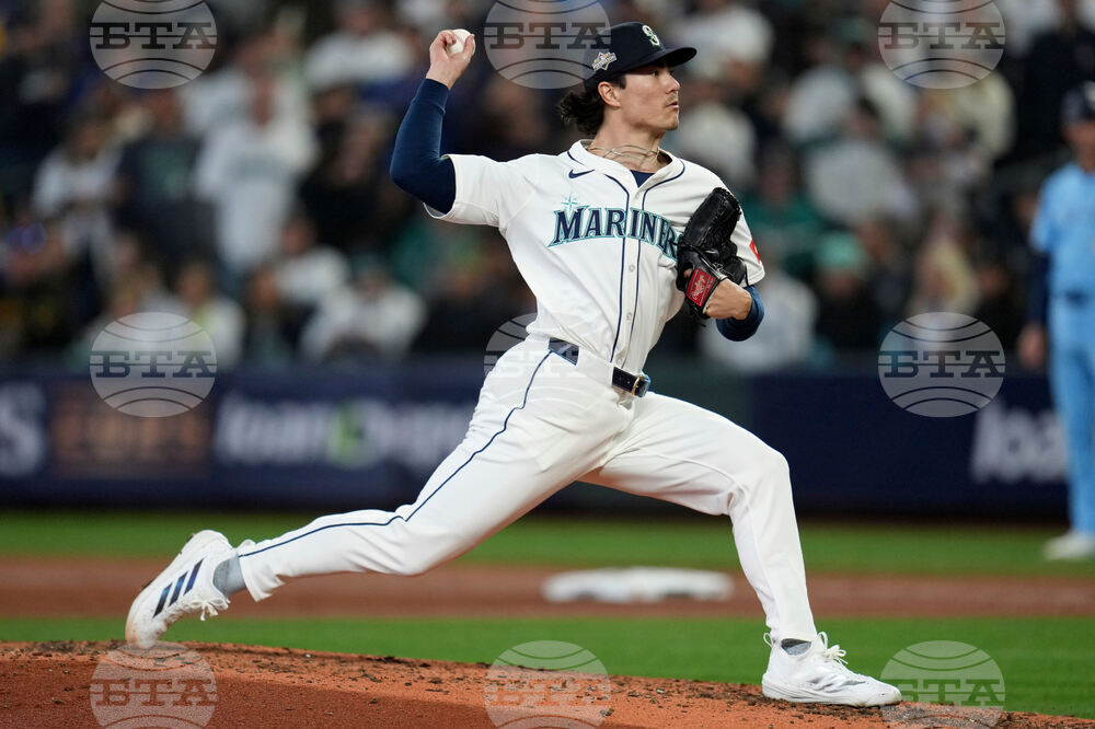 Seattle Mariners pitcher Bryan Woo throws against the Toronto Blue Jays during the sixth inning in Game 5 of baseball's American League Championship Series, Friday, Oct. 17, 2025, in Seattle. (AP Photo/Abbie Parr)