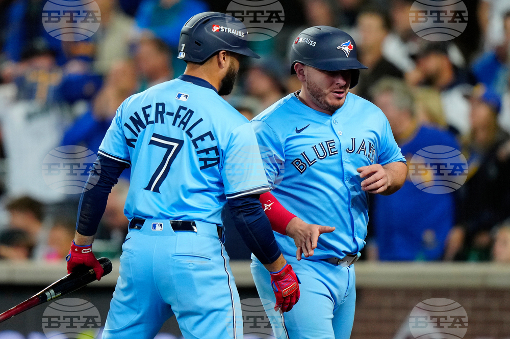 Toronto Blue Jays' George Springer celebrates his RBI double during the fifth inning in Game 5 of baseball's American League Championship Series against the Seattle Mariners, Friday, Oct. 17, 2025, in Seattle. (AP Photo/Lindsey Wasson)