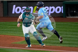 Toronto Blue Jays' Alejandro Kirk (30) scores on a single Ernie Clement as Seattle Mariners catcher Cal Raleigh reaches for the throw during the sixth inning in Game 5 of baseball's American League Championship Series, Friday, Oct. 17, 2025, in Seattle. (AP Photo/David J. Phillip)
