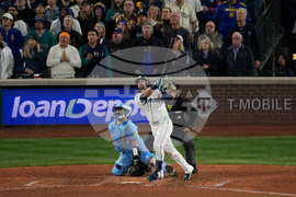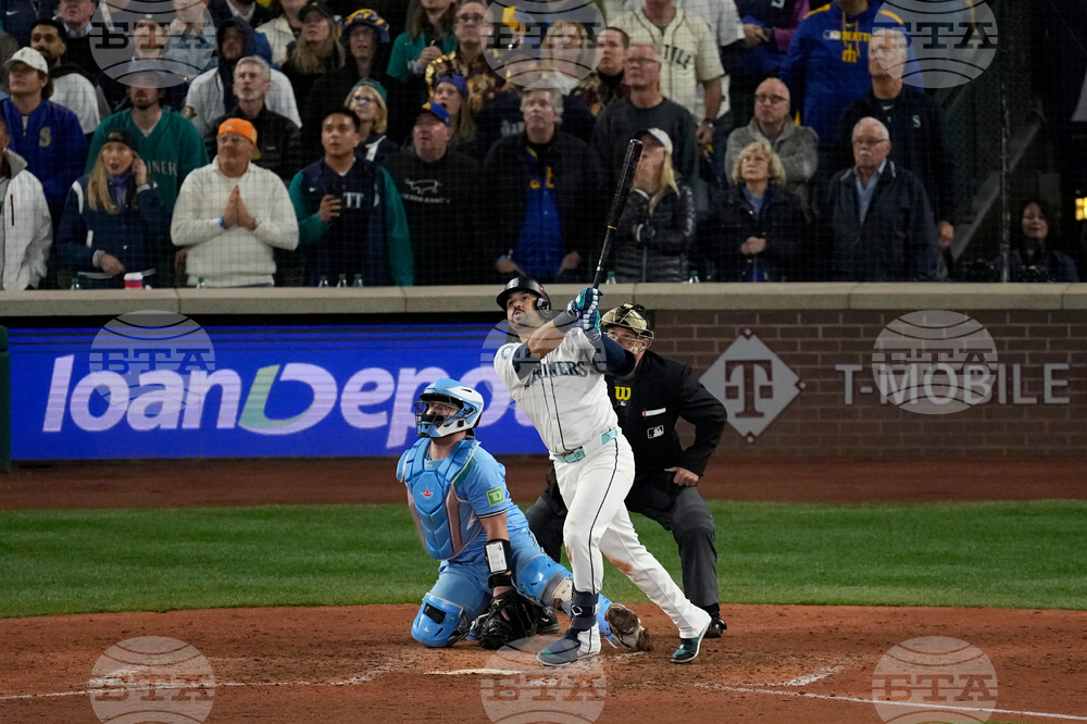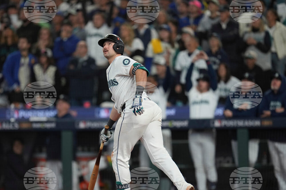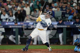 Seattle Mariners' Josh Naylor follows through on a base hit against the Toronto Blue Jays during the fourth inning in Game 5 of baseball's American League Championship Series, Friday, Oct. 17, 2025, in Seattle. (AP Photo/Abbie Parr)