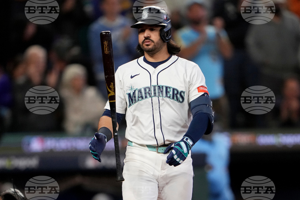 Seattle Mariners' Eugenio Suárez reacts after Game 5 of baseball's American League Championship Series against the Toronto Blue Jays, Friday, Oct. 17, 2025, in Seattle. (AP Photo/Lindsey Wasson)