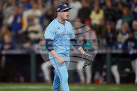 Toronto Blue Jays pitcher Kevin Gausman leaves the games during the sixth inning in Game 5 of baseball's American League Championship Series against the Seattle Mariners, Friday, Oct. 17, 2025, in Seattle. (AP Photo/Abbie Parr)