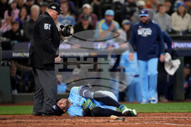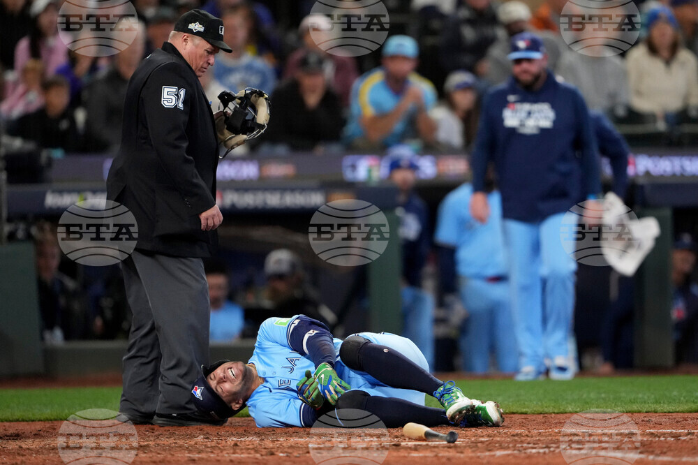 Toronto Blue Jays' George Springer falls after being hit by a pitch against the Seattle Mariners during the seventh inning in Game 5 of baseball's American League Championship Series, Friday, Oct. 17, 2025, in Seattle. (AP Photo/Abbie Parr)