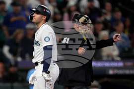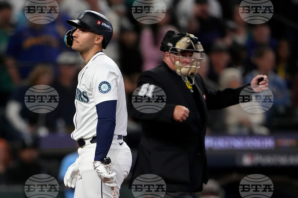 Seattle Mariners' Dominic Canzone reacts to being called out on strikes during the eighth inning in Game 5 of baseball's American League Championship Series against the Toronto Blue Jays, Friday, Oct. 17, 2025, in Seattle. (AP Photo/Lindsey Wasson)