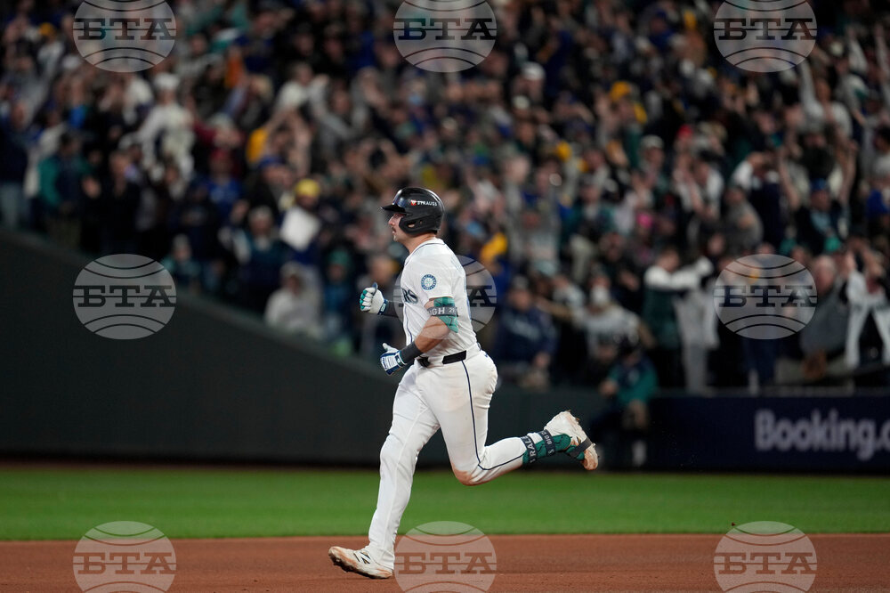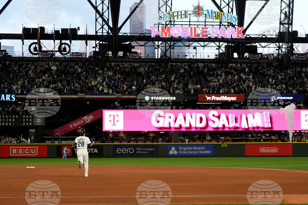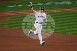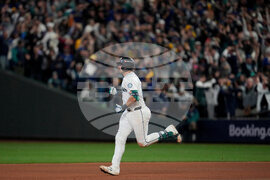 Seattle Mariners' Eugenio Suárez rounds the bases after hitting a grand slam home run during the eighth inning in Game 5 of baseball's American League Championship Series against the Toronto Blue Jays, Friday, Oct. 17, 2025, in Seattle. (AP Photo/Lindsey Wasson)