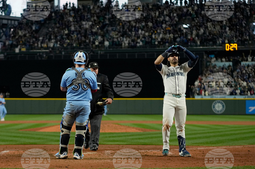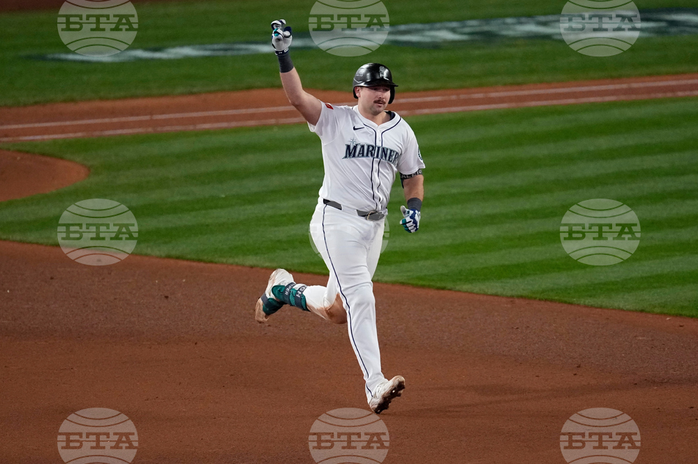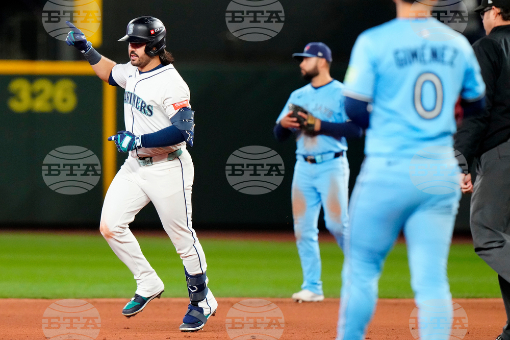 Seattle Mariners' Eugenio Suárez, left, rounds the bases after hitting a grand slam during the eighth inning of Game 5 of baseball's American League Championship Series against the Toronto Blue Jays in Seattle, Friday, Oct. 17, 2025. (Frank Gunn/The Canadian Press via AP)