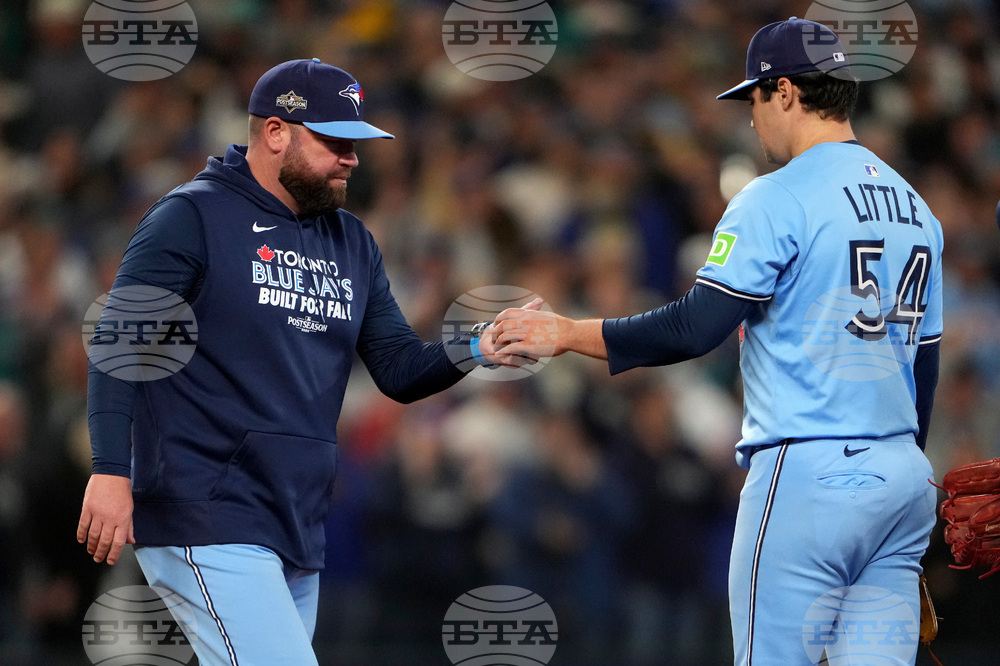 Toronto Blue Jays John Schneider pulls pitcher Brendon Little (54) during the eighth inning in Game 5 of baseball's American League Championship Series against the Seattle Mariners, Friday, Oct. 17, 2025, in Seattle. (AP Photo/Lindsey Wasson)