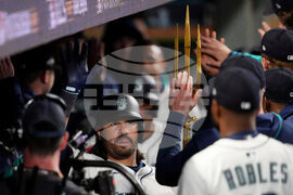 Seattle Mariners' Eugenio Suárez (28) comes in to celebrate with teammates after hitting a grand slam during the eighth inning of Game 5 of baseball's American League Championship Series against the Toronto Blue Jays in Seattle, Friday, Oct. 17, 2025. (Frank Gunn/The Canadian Press via AP)
