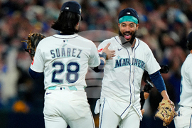 Seattle Mariners third baseman Eugenio Suárez (28) and teammate J.P. Crawford, right, celebrate after their win over the Toronto Blue Jays in Game 5 of baseball's American League Championship Series in Seattle, Friday, Oct. 17, 2025. (Frank Gunn/The Canadian Press via AP)