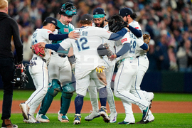 Seattle Mariners players celebrate after Game 5 of baseball's American League Championship Series against the Toronto Blue Jays, Friday, Oct. 17, 2025, in Seattle. (AP Photo/Lindsey Wasson)