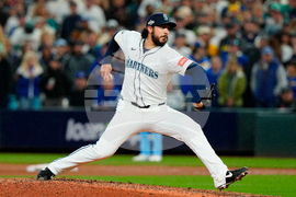 Seattle Mariners pitcher Bryce Miller (50) leaves the field to cheers from the crowd at the end of the fourth inning of Game 5 of baseball's American League Championship Series against the Toronto Blue Jays in Seattle, Friday, Oct. 17, 2025. (Frank Gunn/The Canadian Press via AP)