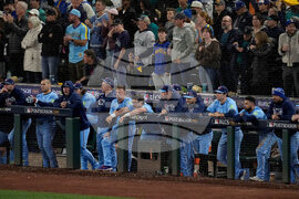 Toronto Blue Jays players watch from the dugout during the ninth inning in Game 5 of baseball's American League Championship Series against the Seattle Mariners, Friday, Oct. 17, 2025, in Seattle. (AP Photo/David J. Phillip)