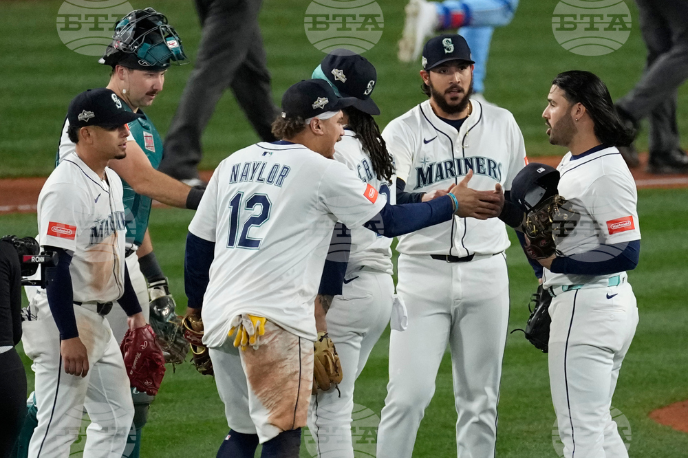 Seattle Mariners players celebrate after their win over the Toronto Blue Jays in Game 5 of baseball's American League Championship Series in Seattle, Friday, Oct. 17, 2025. (Frank Gunn/The Canadian Press via AP)