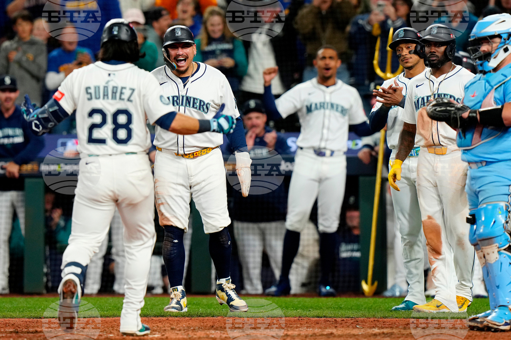 Seattle Mariners' Eugenio Suárez celebrates after hitting a grand slam home run during the eighth inning in Game 5 of baseball's American League Championship Series against the Toronto Blue Jays, Friday, Oct. 17, 2025, in Seattle. (AP Photo/Lindsey Wasson)