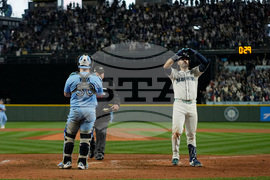 Seattle Mariners pitcher Bryce Miller leaves the game during the fifth inning in Game 5 of baseball's American League Championship Series against the Toronto Blue Jays, Friday, Oct. 17, 2025, in Seattle. (AP Photo/David J. Phillip)