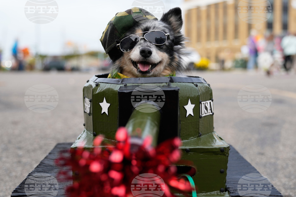 Mojo, a dog owned by Alicia Town, of Kalamazoo, sits in a tank costume during an event for dog trick-or-treating, Friday, Oct. 17, 2025, in Lansing, Mich. (AP Photo/Ryan Sun)