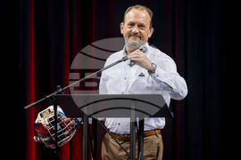 Mayor Gregg Hull speaks about the New Mexico Goatheads, the state's new pro hockey team, at the Rio Rancho Events Center in Rio Rancho, N.M., on Sept. 29, 2025. (Jessica Baca/The Albuquerque Journal via AP)