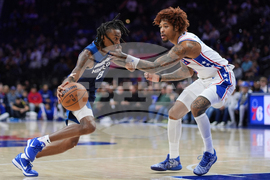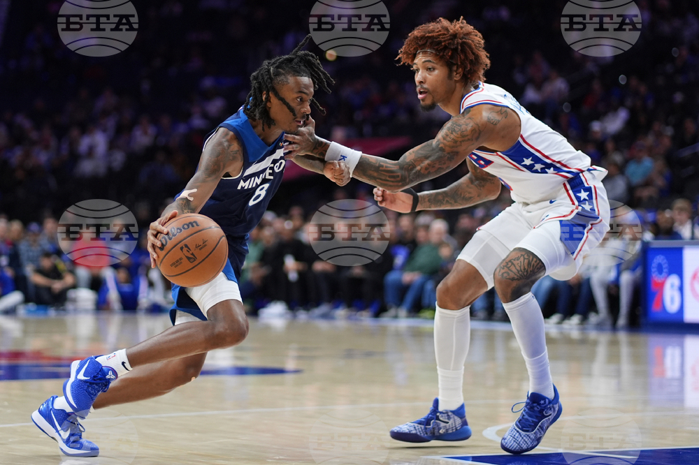 Minnesota Timberwolves' Bones Hyland, left, tries to get past Philadelphia 76ers' Kelly Oubre Jr. during the first half of a preseason NBA basketball game Friday, Oct. 17, 2025, in Philadelphia. (AP Photo/Matt Slocum)