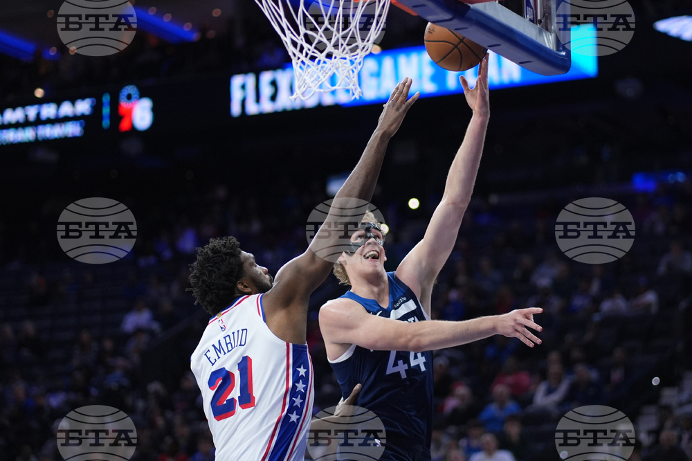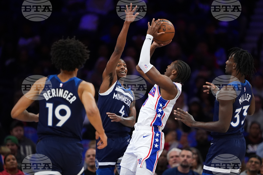 Minnesota Timberwolves' Jules Bernard (14) goes up for a shot against Philadelphia 76ers' Justin Edwards (11) during the second half of a preseason NBA basketball game Friday, Oct. 17, 2025, in Philadelphia. (AP Photo/Matt Slocum)
